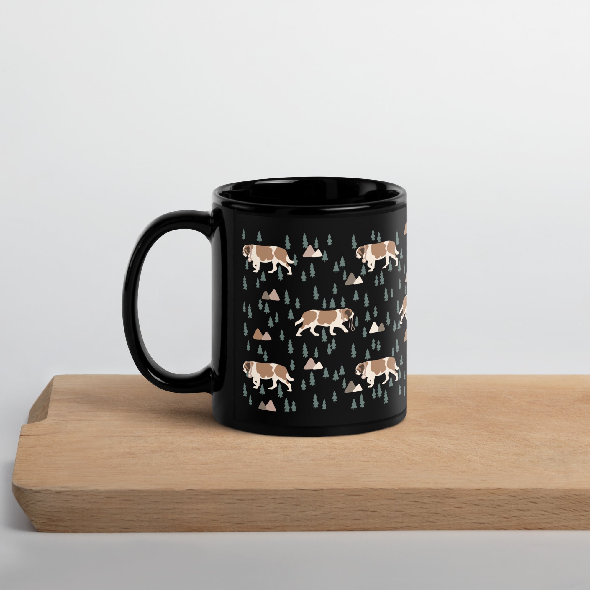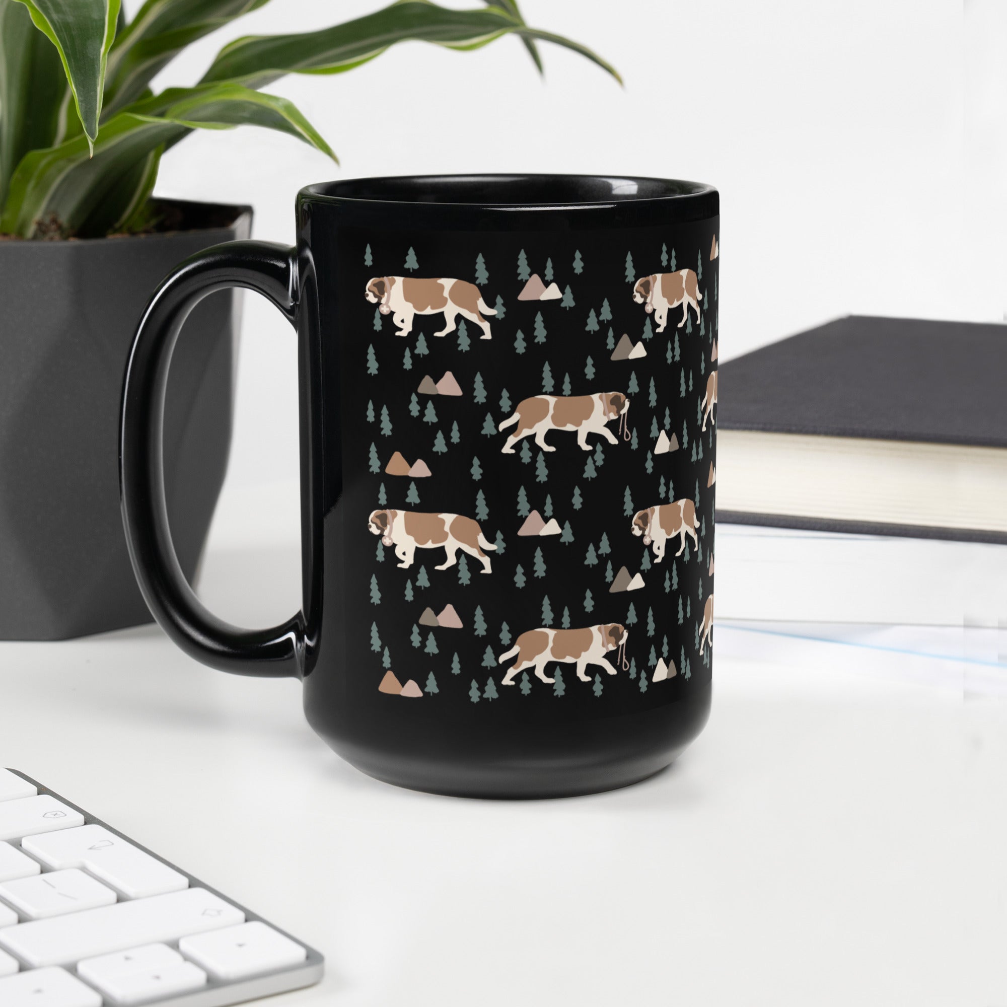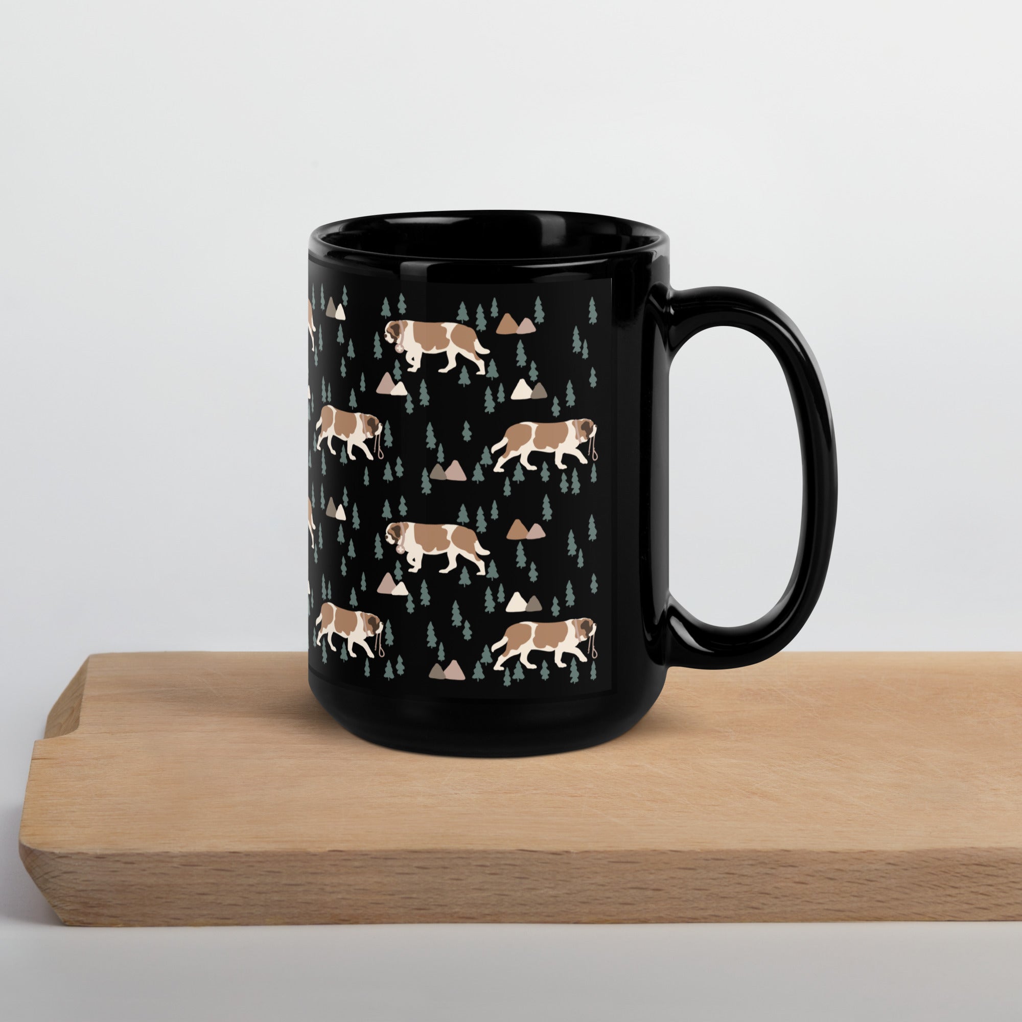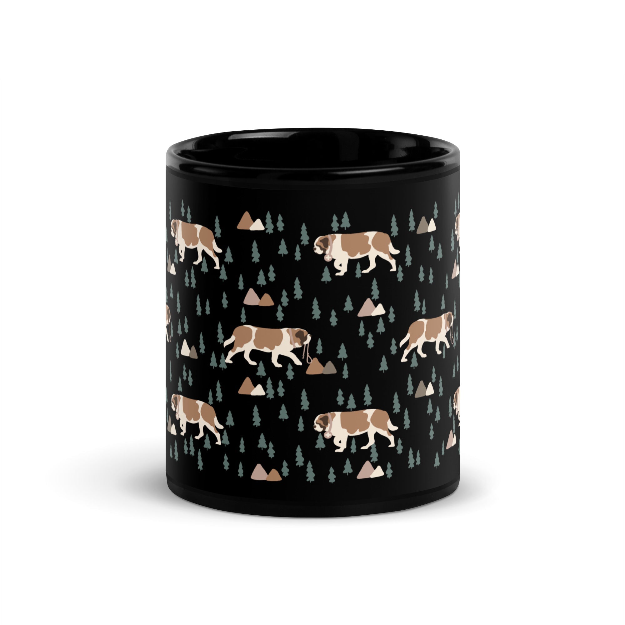 Start your day with a little mountain magic and a lot of Saint Bernard charm! This sturdy black ceramic mug features an all-over print of our beloved Saint Lucy wandering through a pine-dotted mountain landscape. Dishwasher and microwave safe, it’s ready to handle your morning coffee, evening tea, or anything in between, with style.