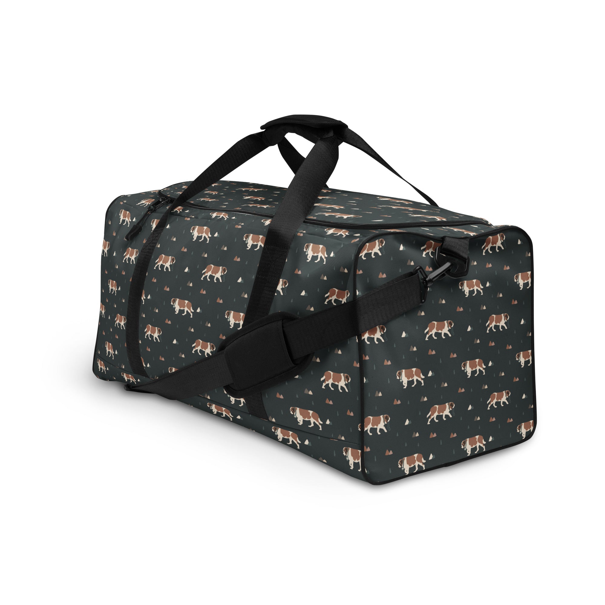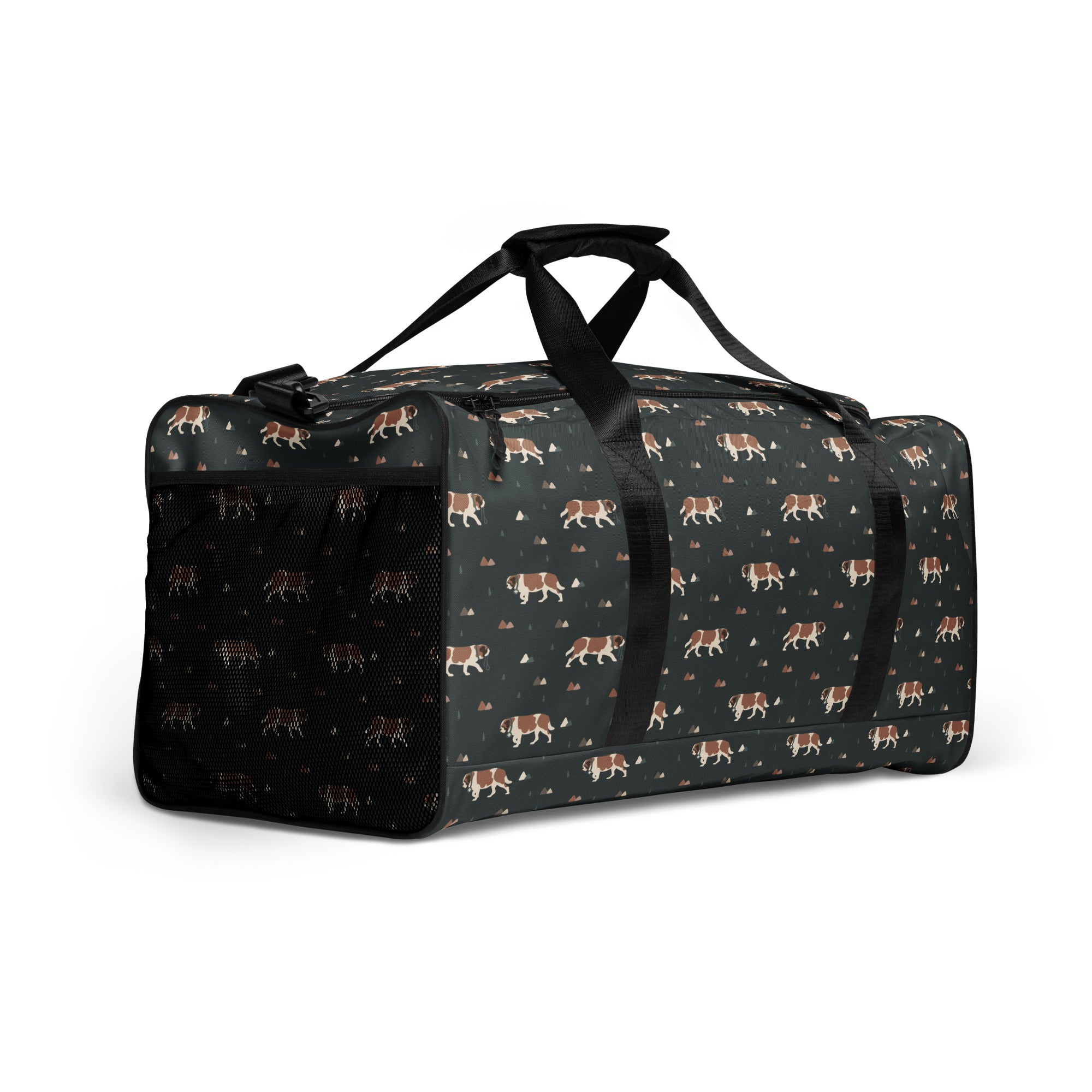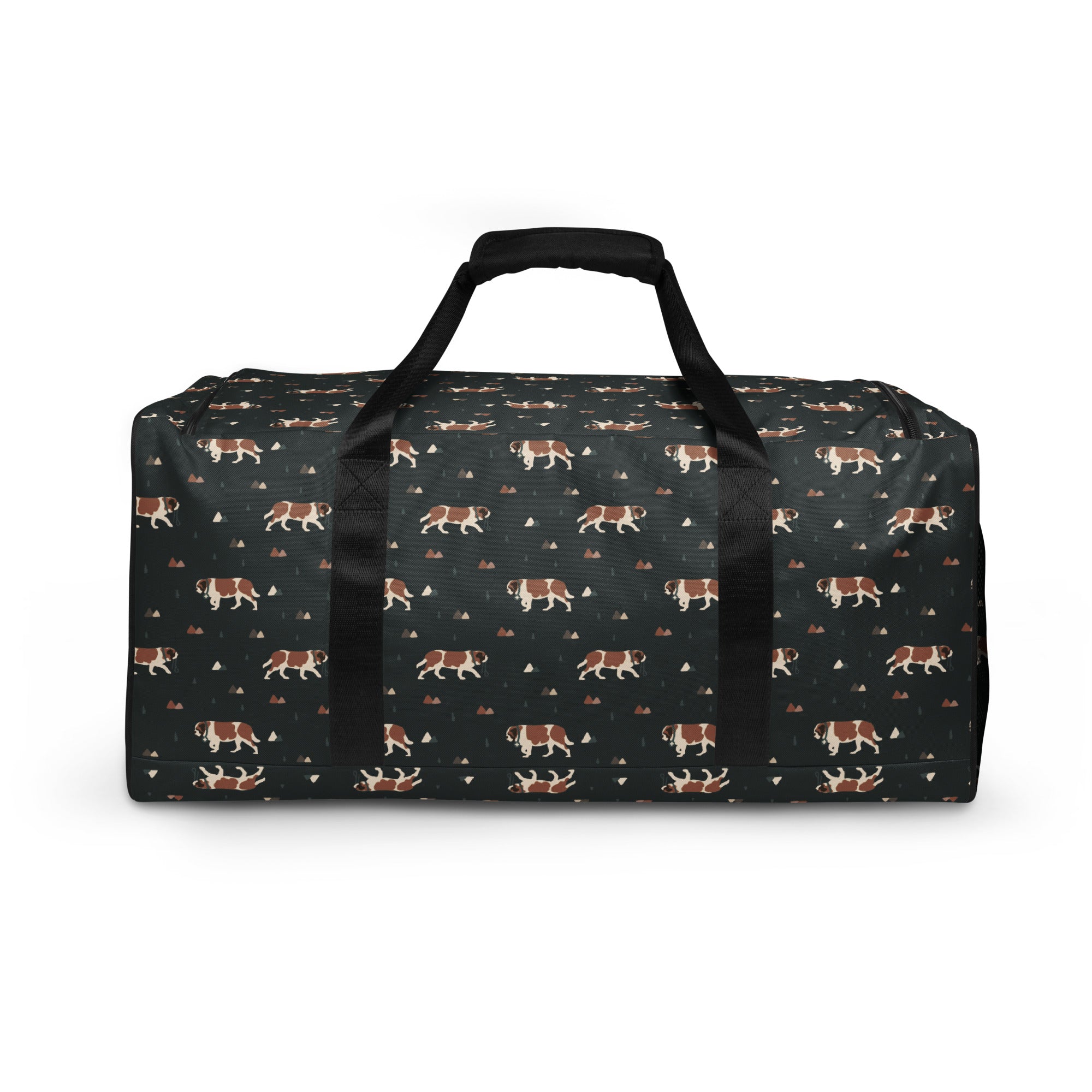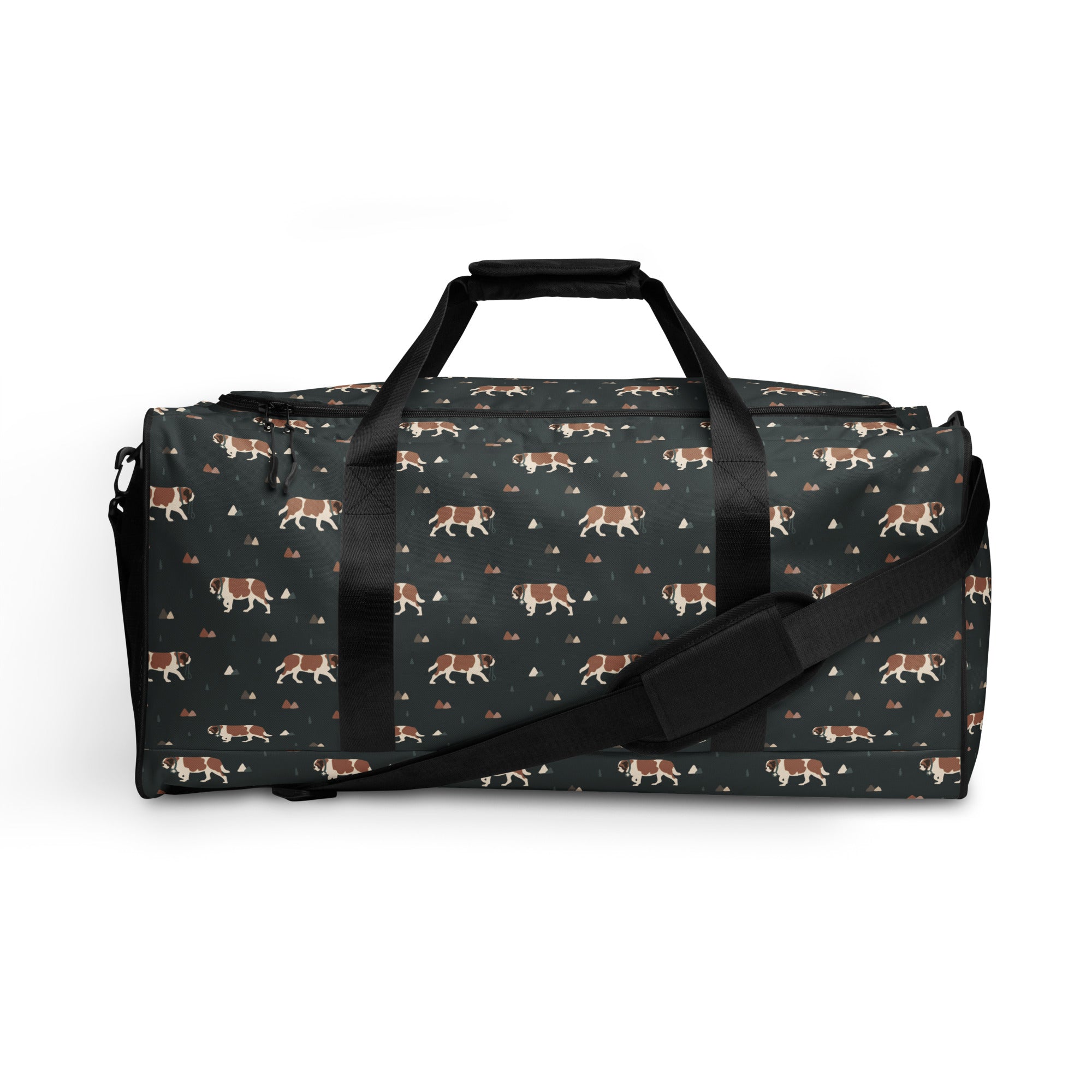 Our Green Mountain Saint Bernard Duffle Bag is made for those who love fresh air, forest trails, and gentle giants by their side. Featuring a moody mountain-inspired pattern with roaming Saint Bernards, this bag blends adventure vibes with everyday practicality.
