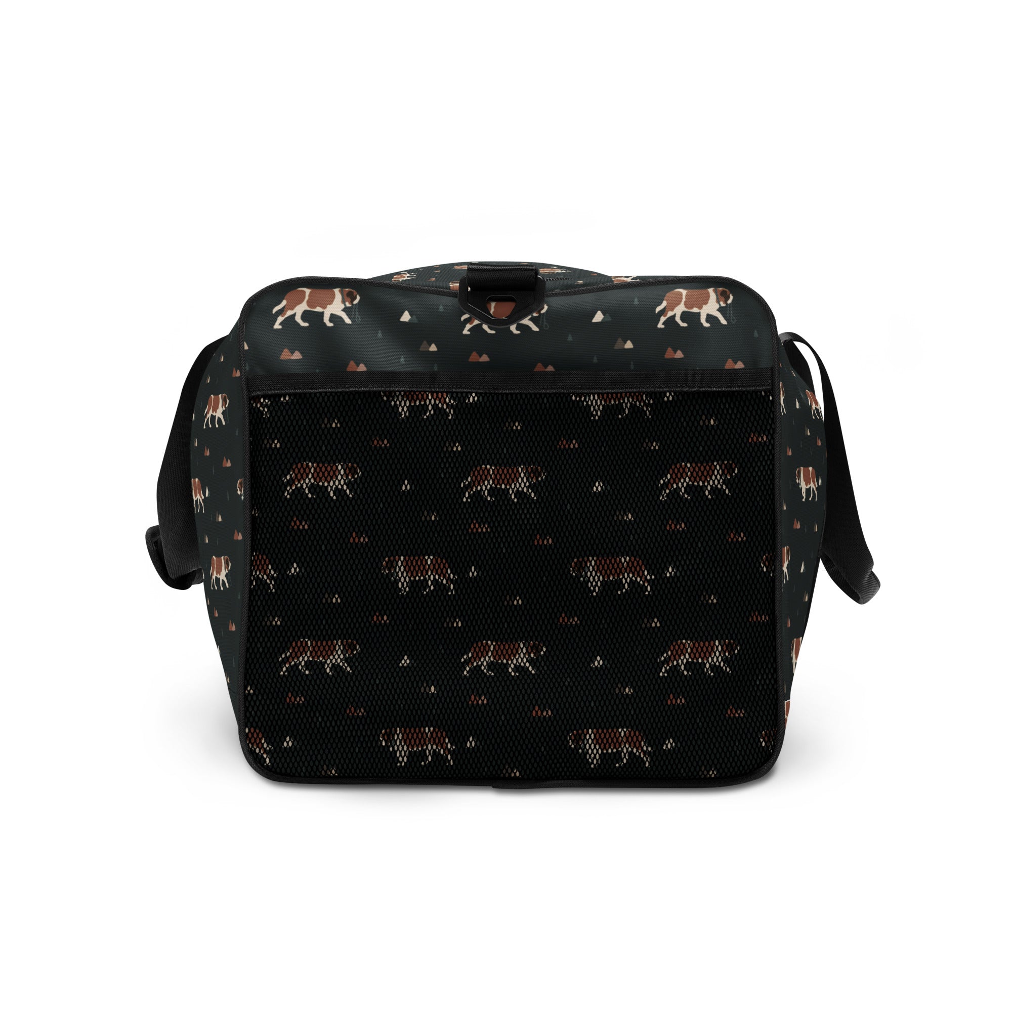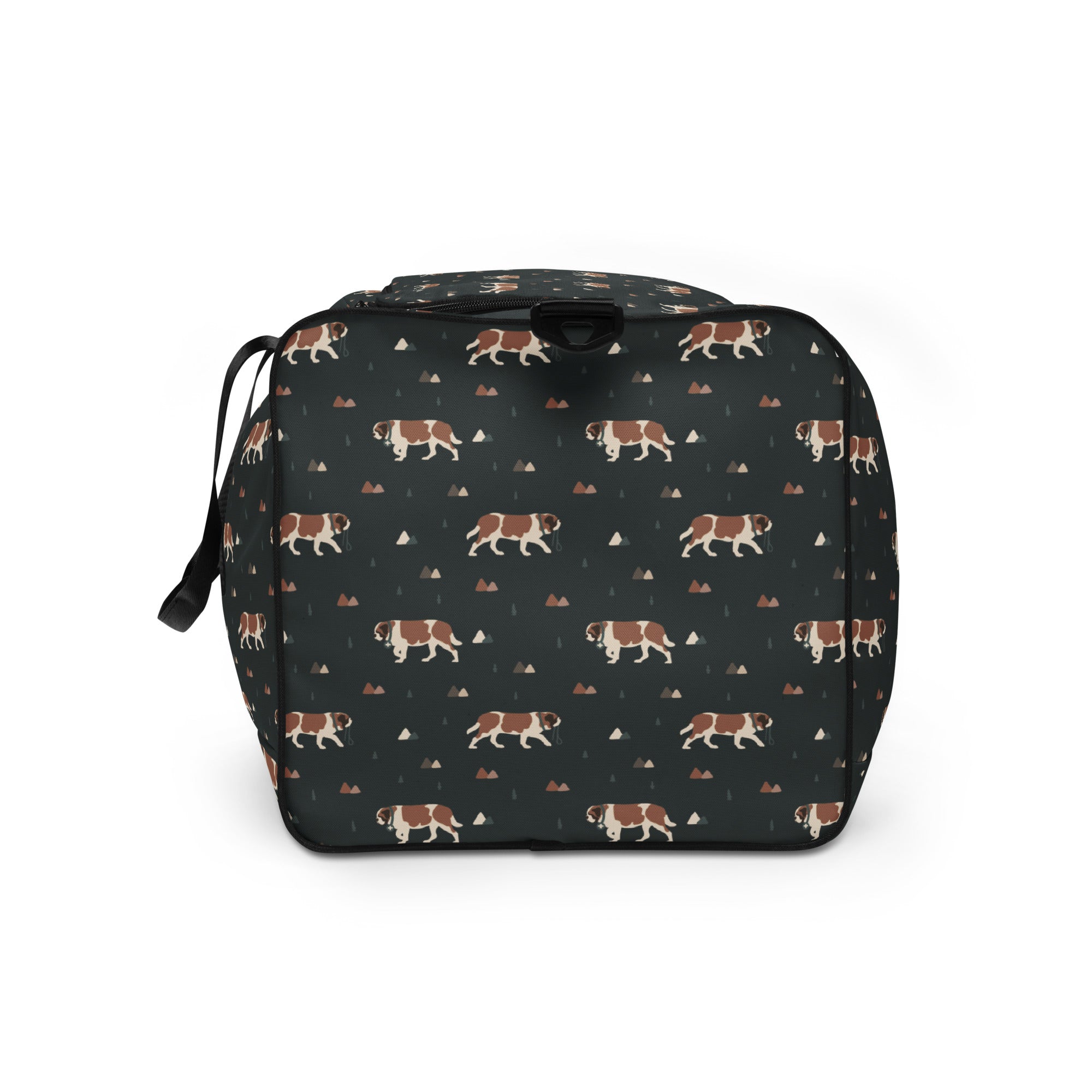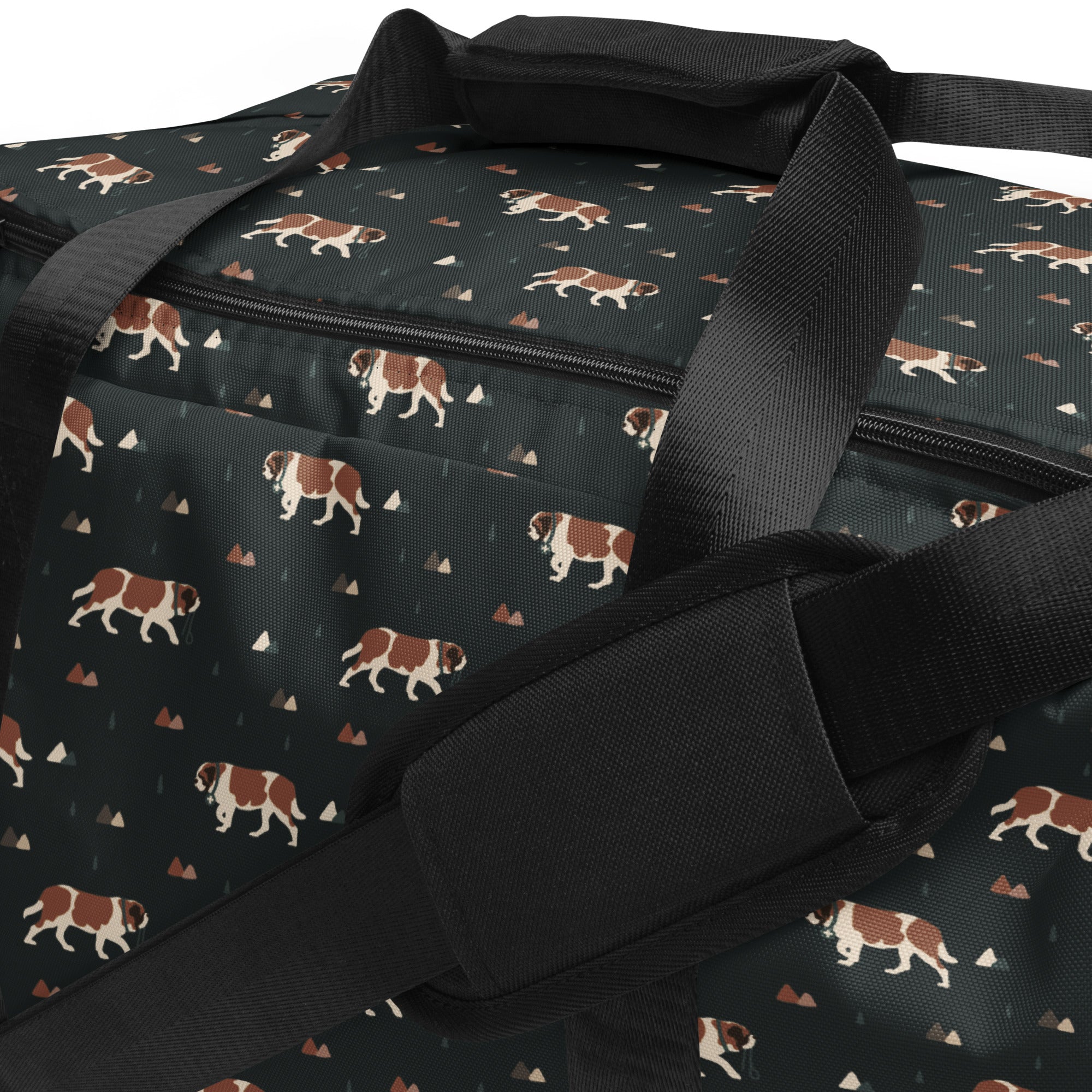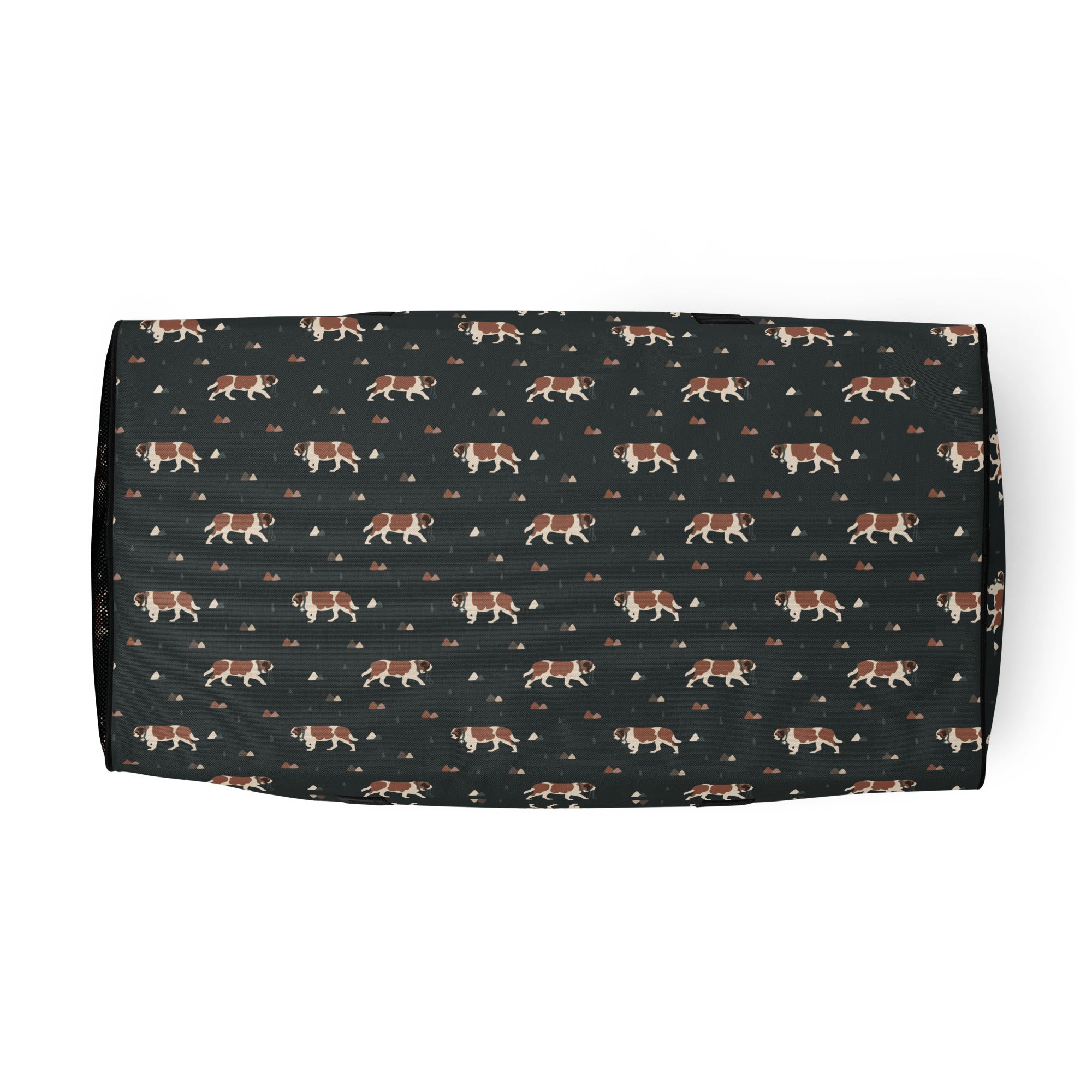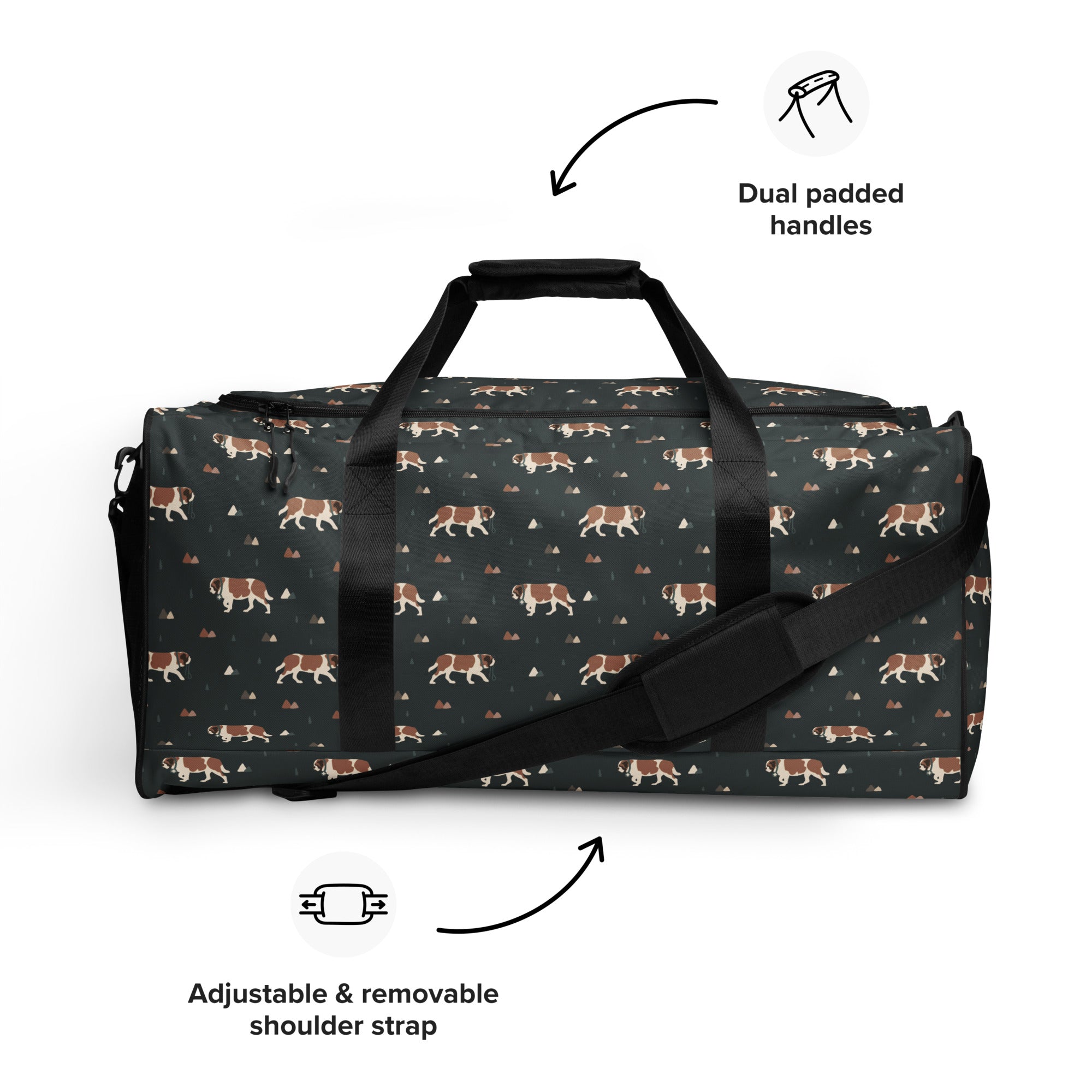 Our Green Mountain Saint Bernard Duffle Bag is made for those who love fresh air, forest trails, and gentle giants by their side. Featuring a moody mountain-inspired pattern with roaming Saint Bernards, this bag blends adventure vibes with everyday practicality.