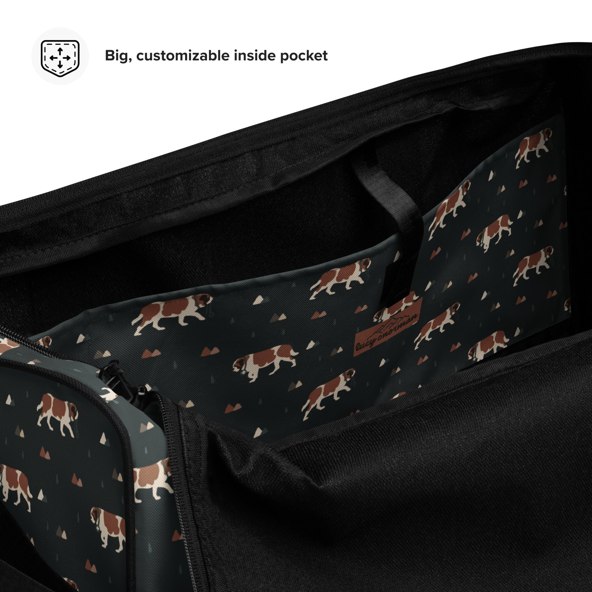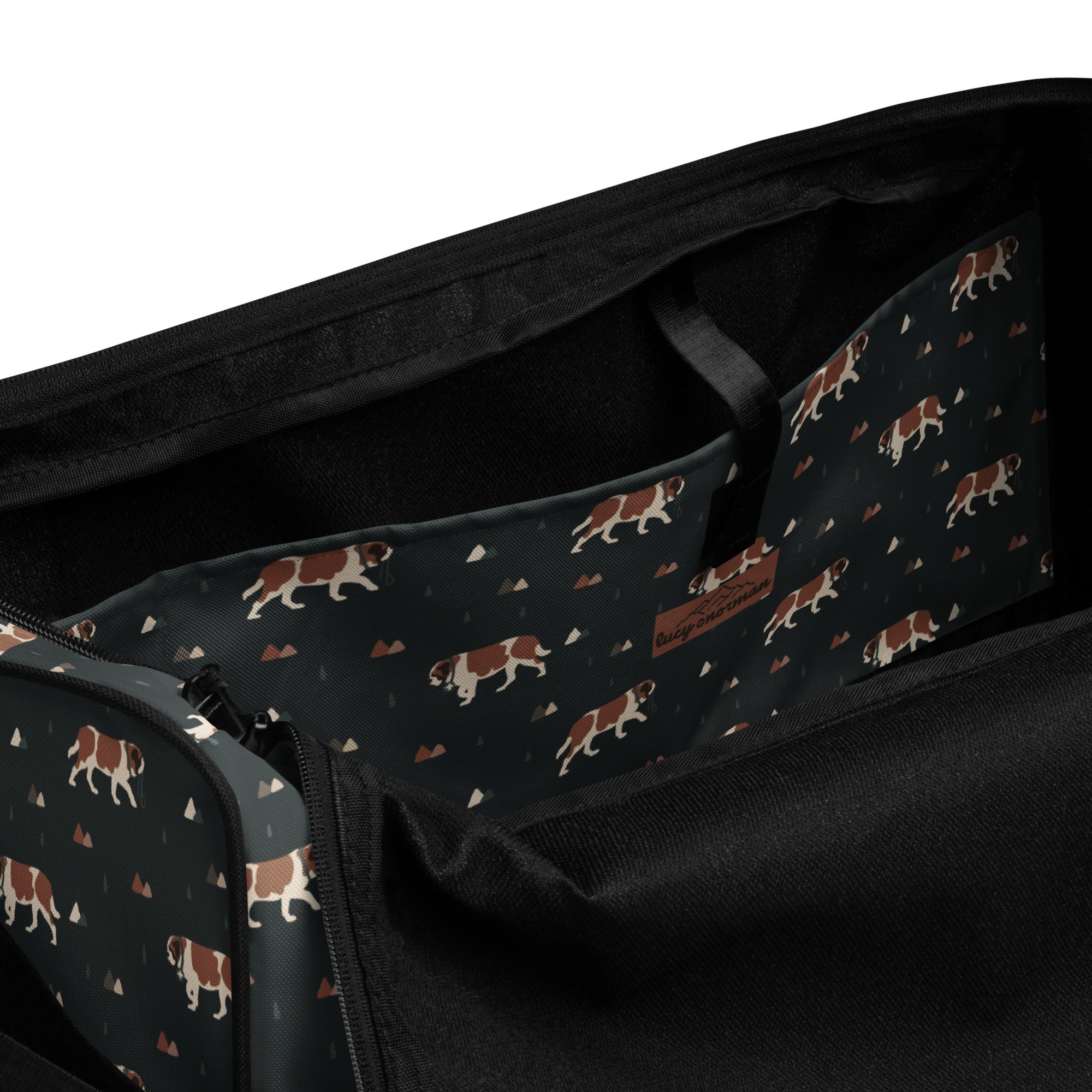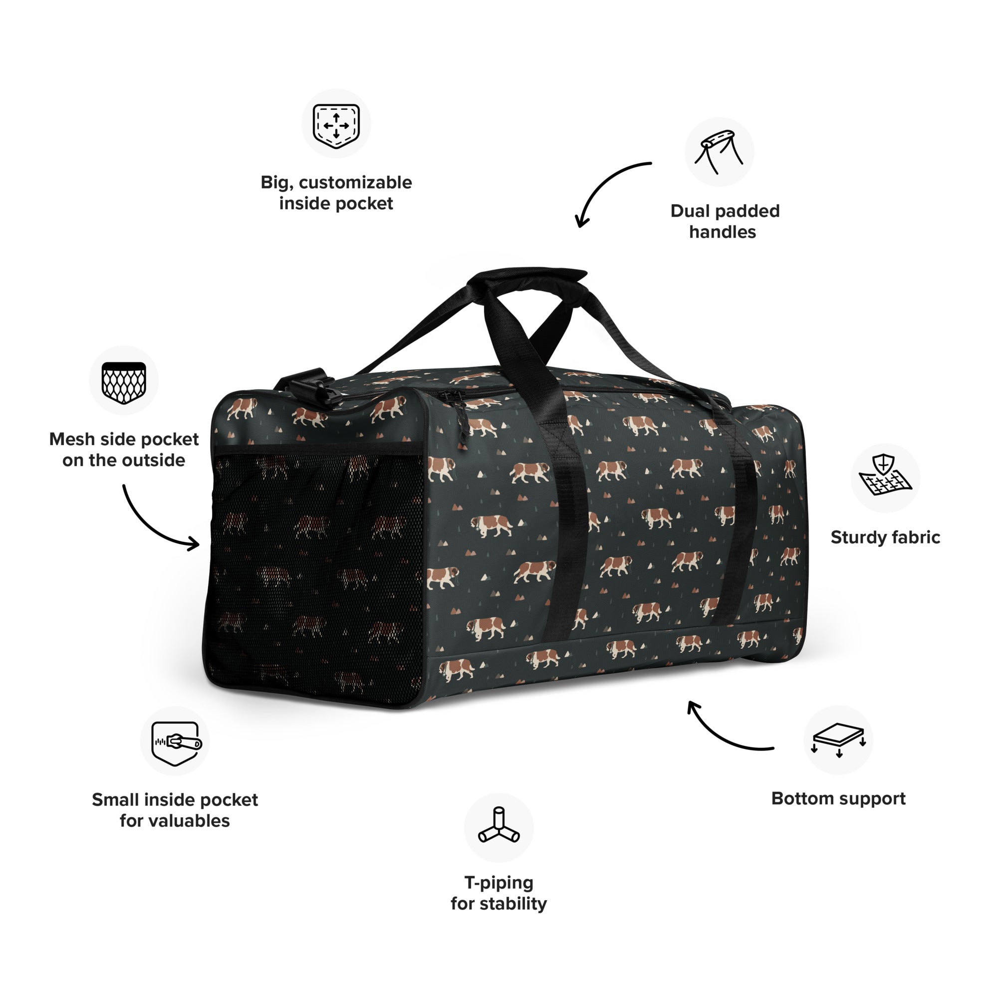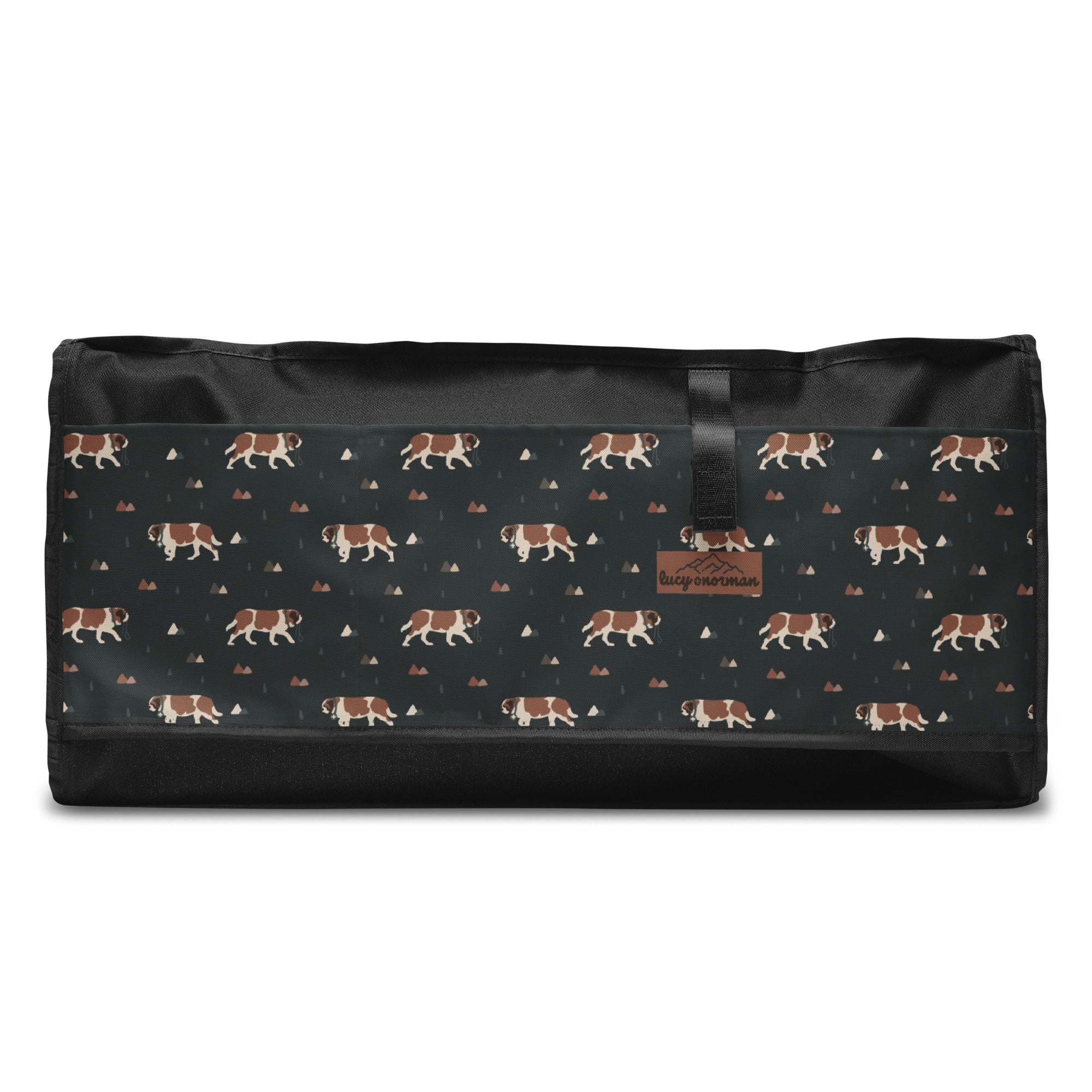Our Green Mountain Saint Bernard Duffle Bag is made for those who love fresh air, forest trails, and gentle giants by their side. Featuring a moody mountain-inspired pattern with roaming Saint Bernards, this bag blends adventure vibes with everyday practicality.