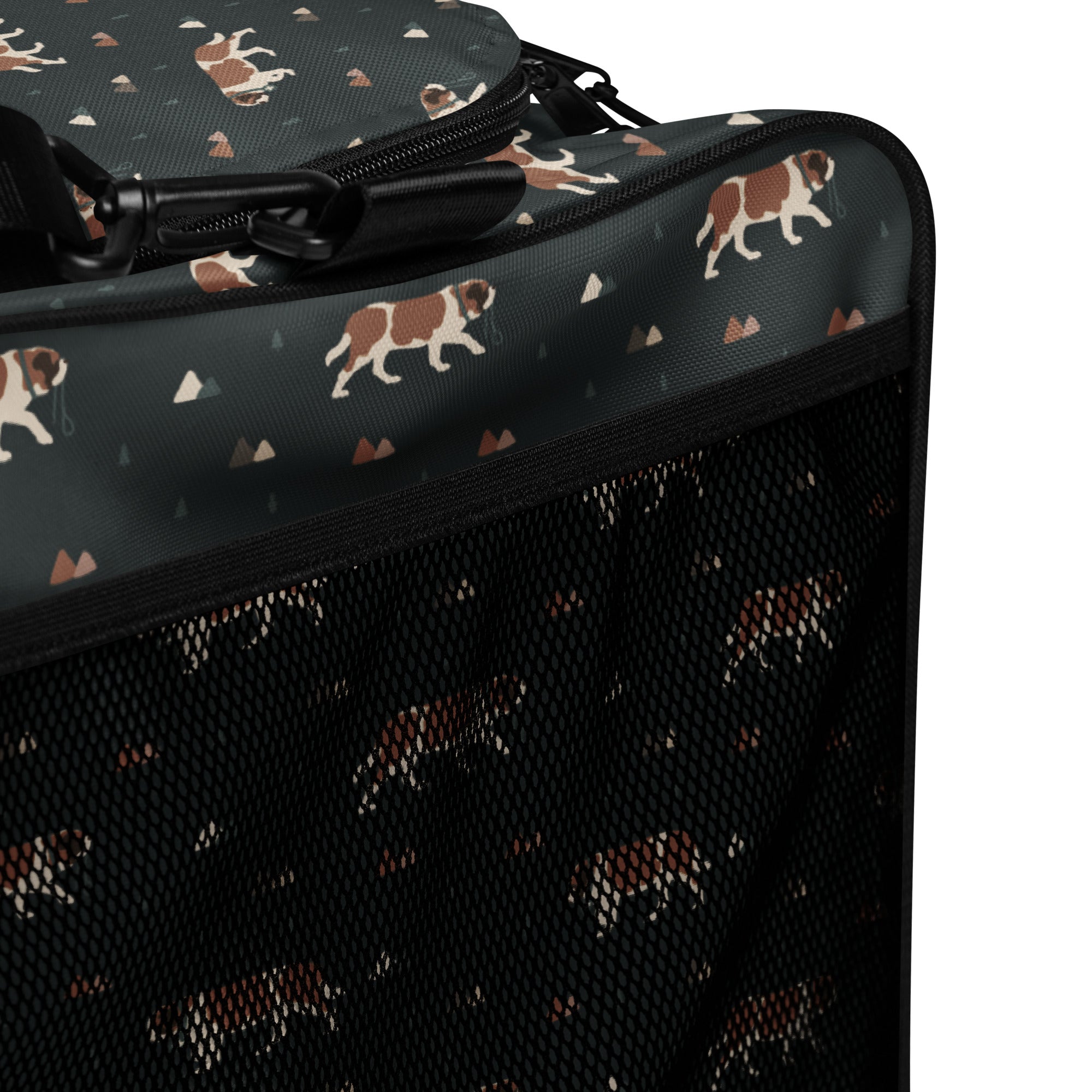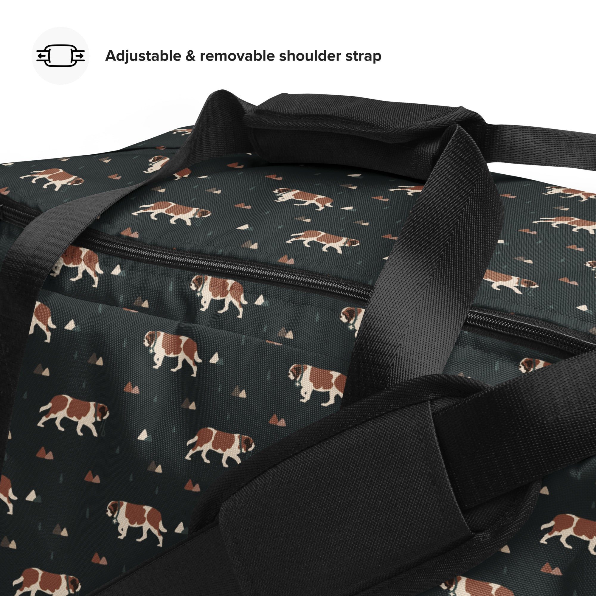 Spacious enough for gym gear, weekend trips, dog show essentials, or road trip must-haves, this duffle keeps everything organized with multiple interior pockets and a secure zippered compartment for your valuables. The adjustable padded shoulder strap and dual carry handles make it comfortable to carry, whether you’re hauling hiking layers, treats, or your Saint’s favorite drool rag.