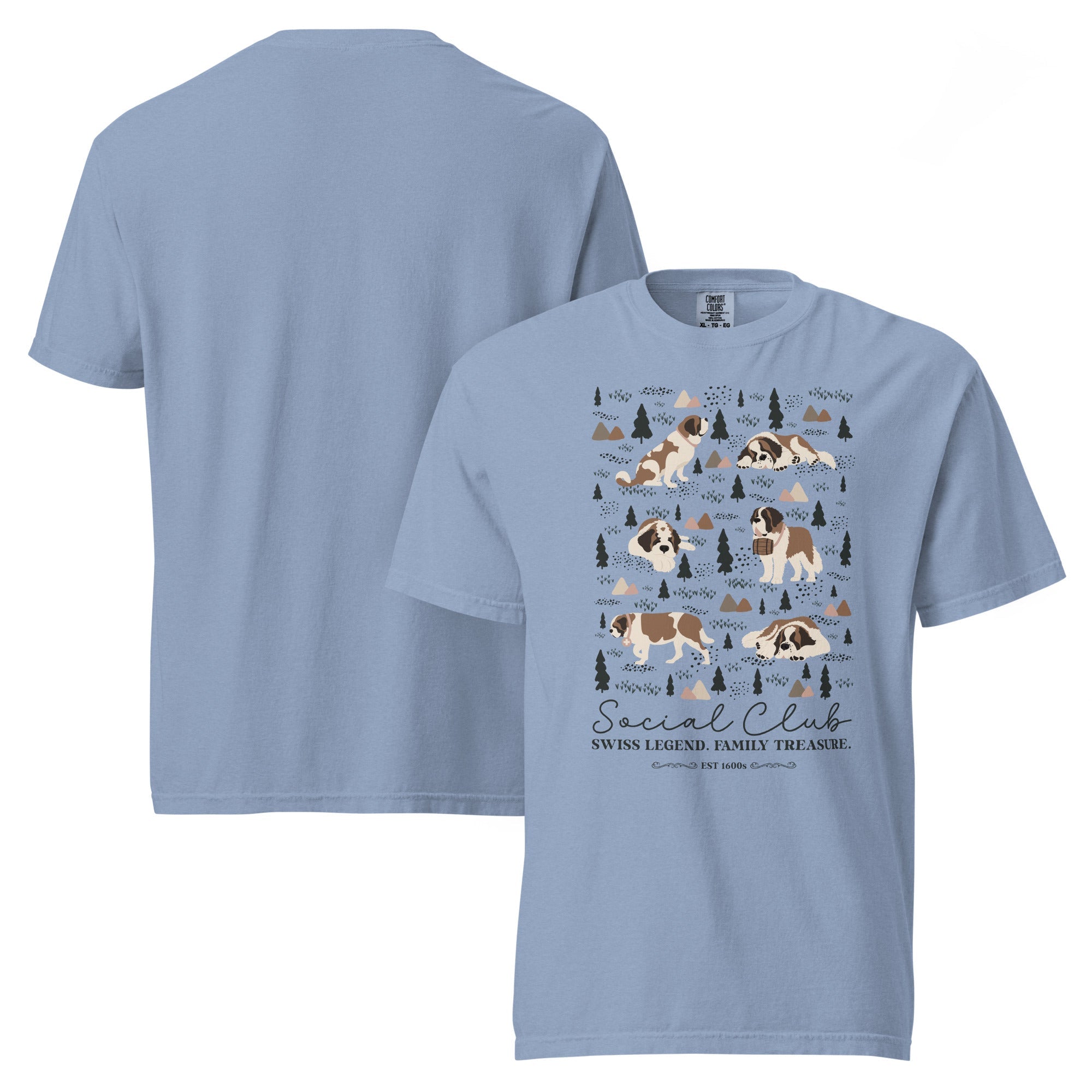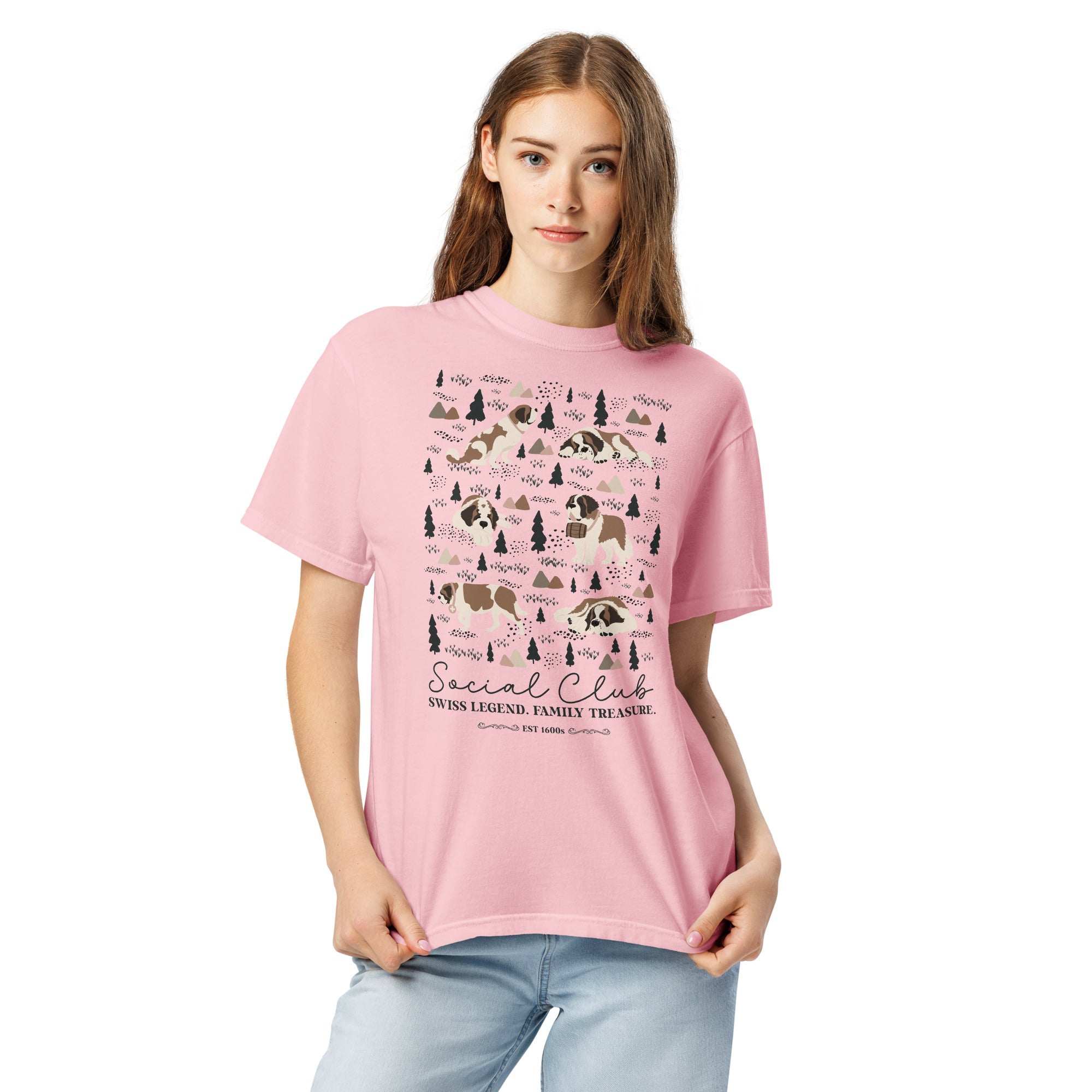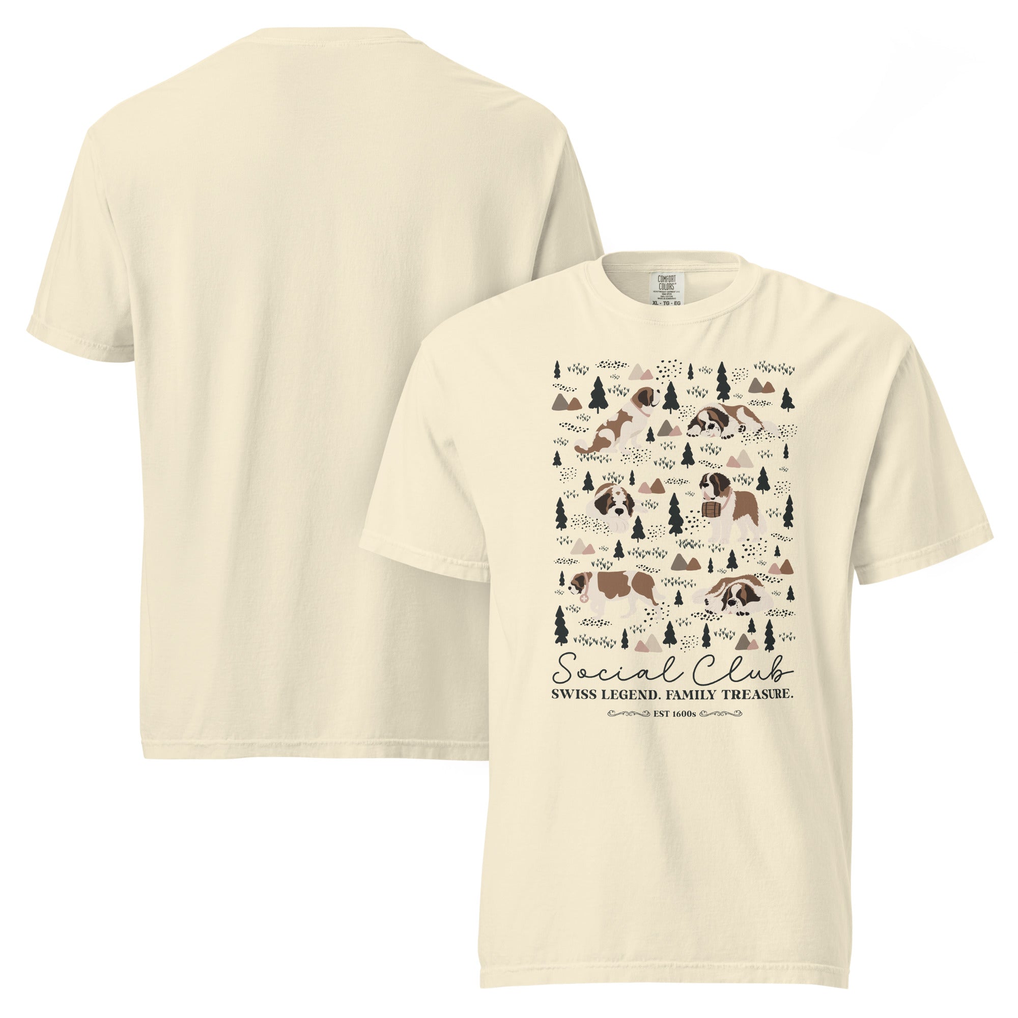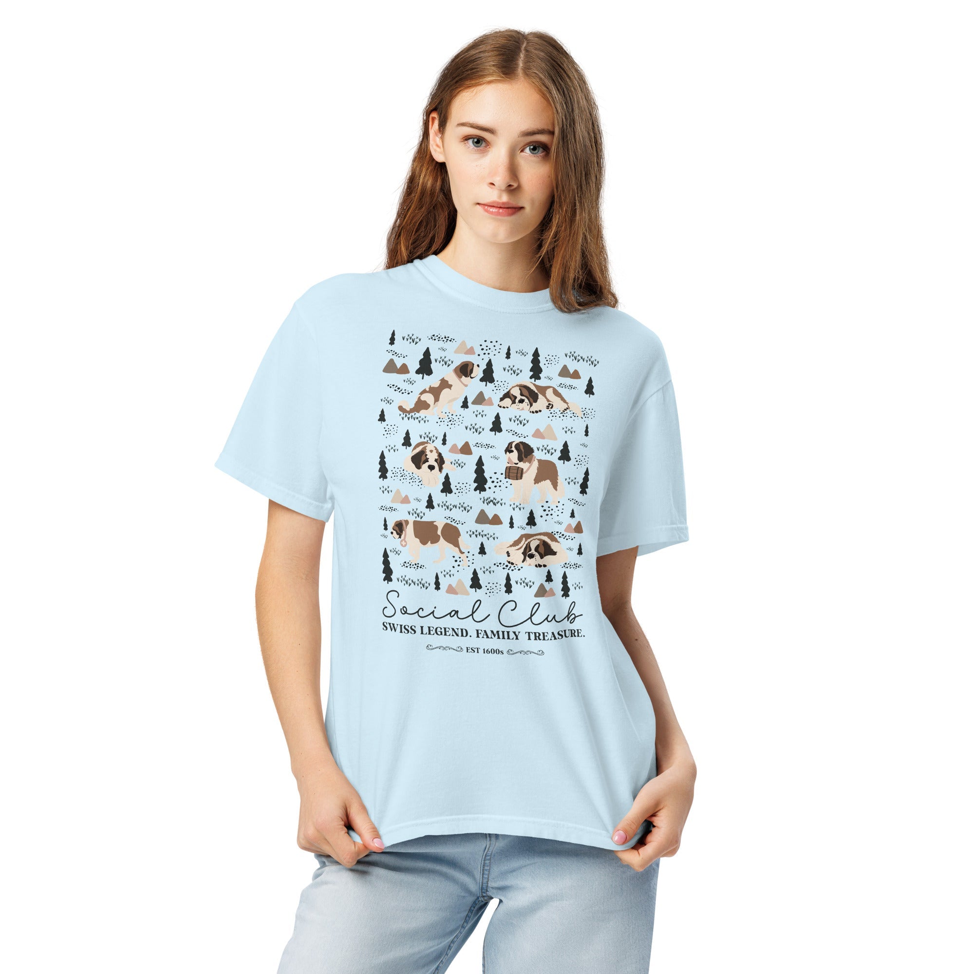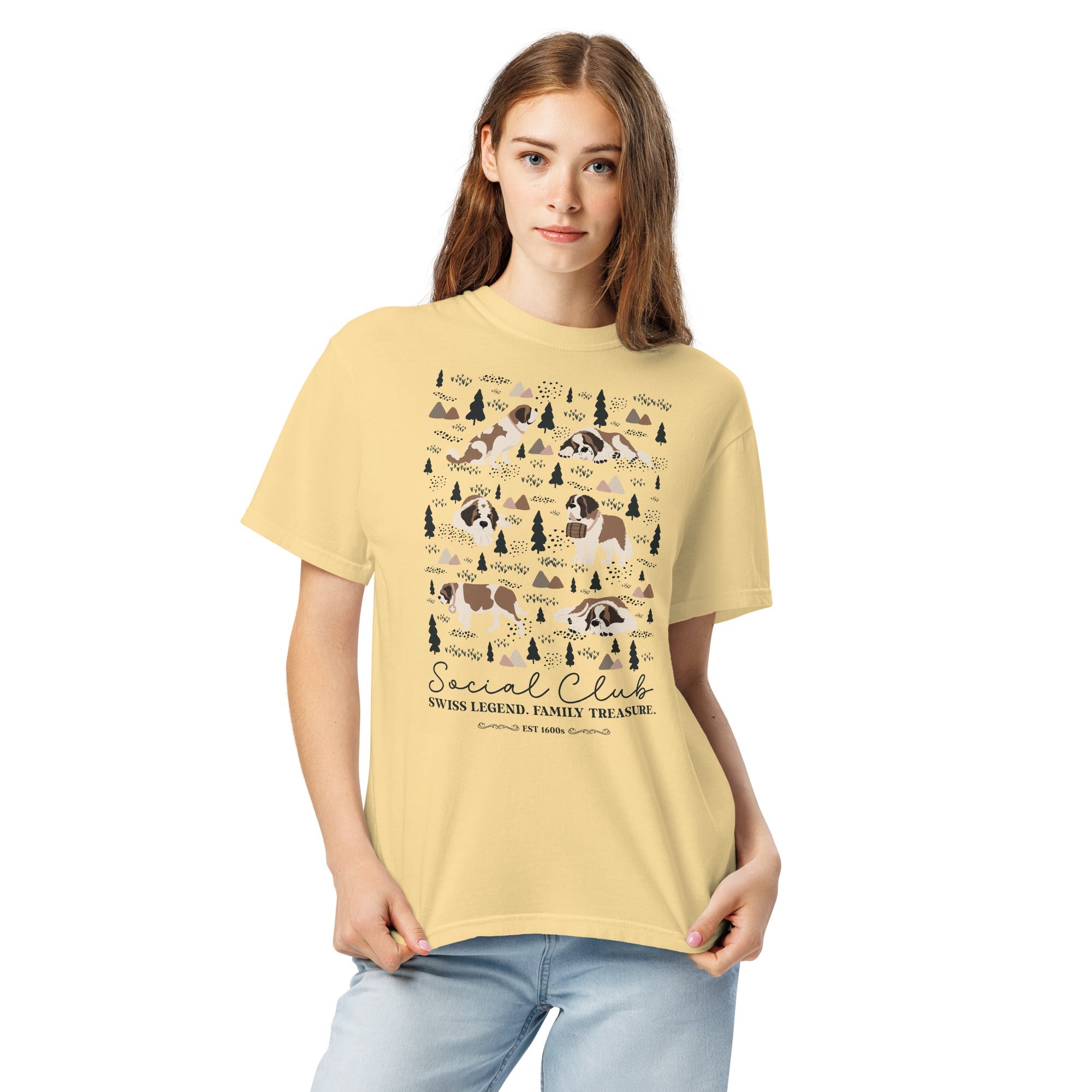This heavyweight Comfort Colors® tee combines a structured fit with a soft, lived-in feel, thanks to garment-dyeing. Featuring a charming woodland, mountain and Saint Bernard design on the back, it’s the perfect gift for St Bernard dog lovers and anyone who appreciates cozy, timeless style.