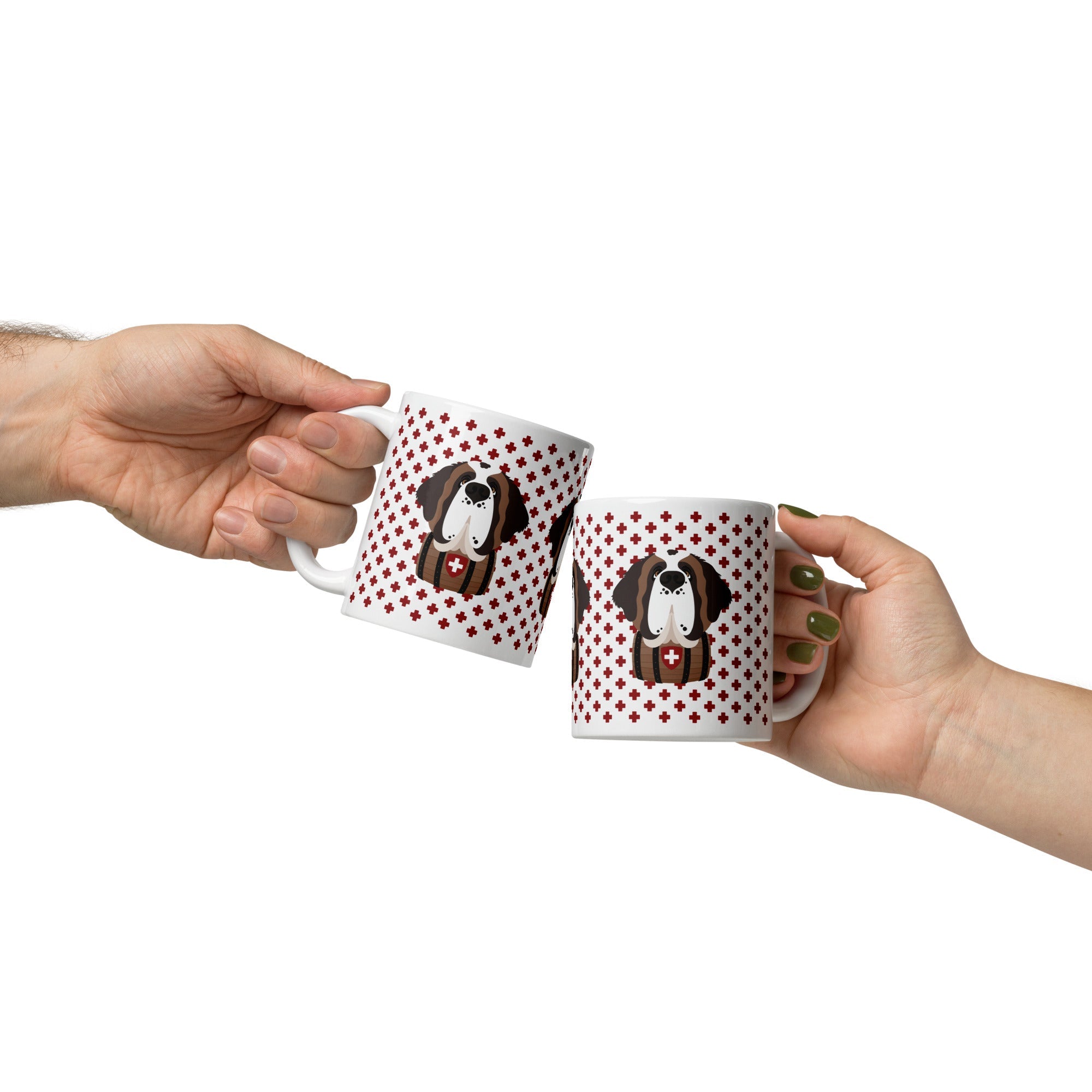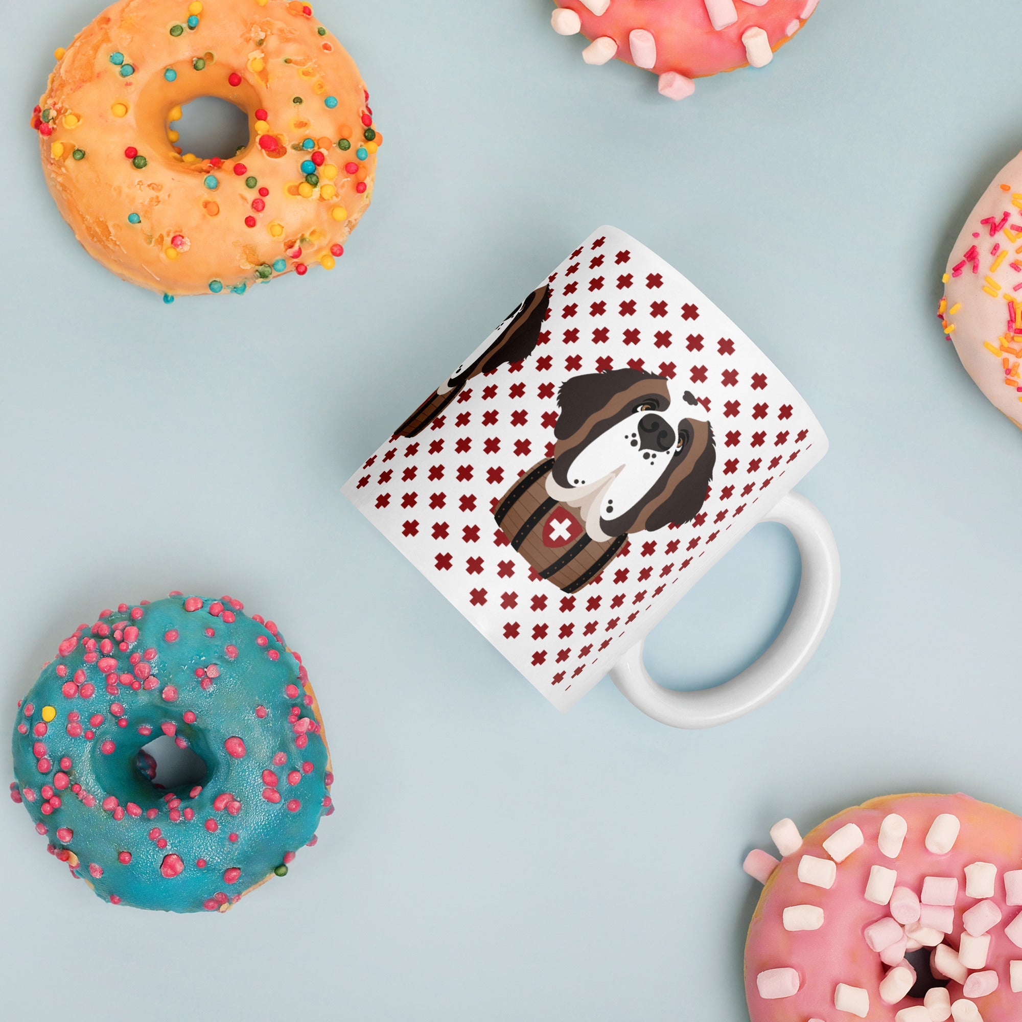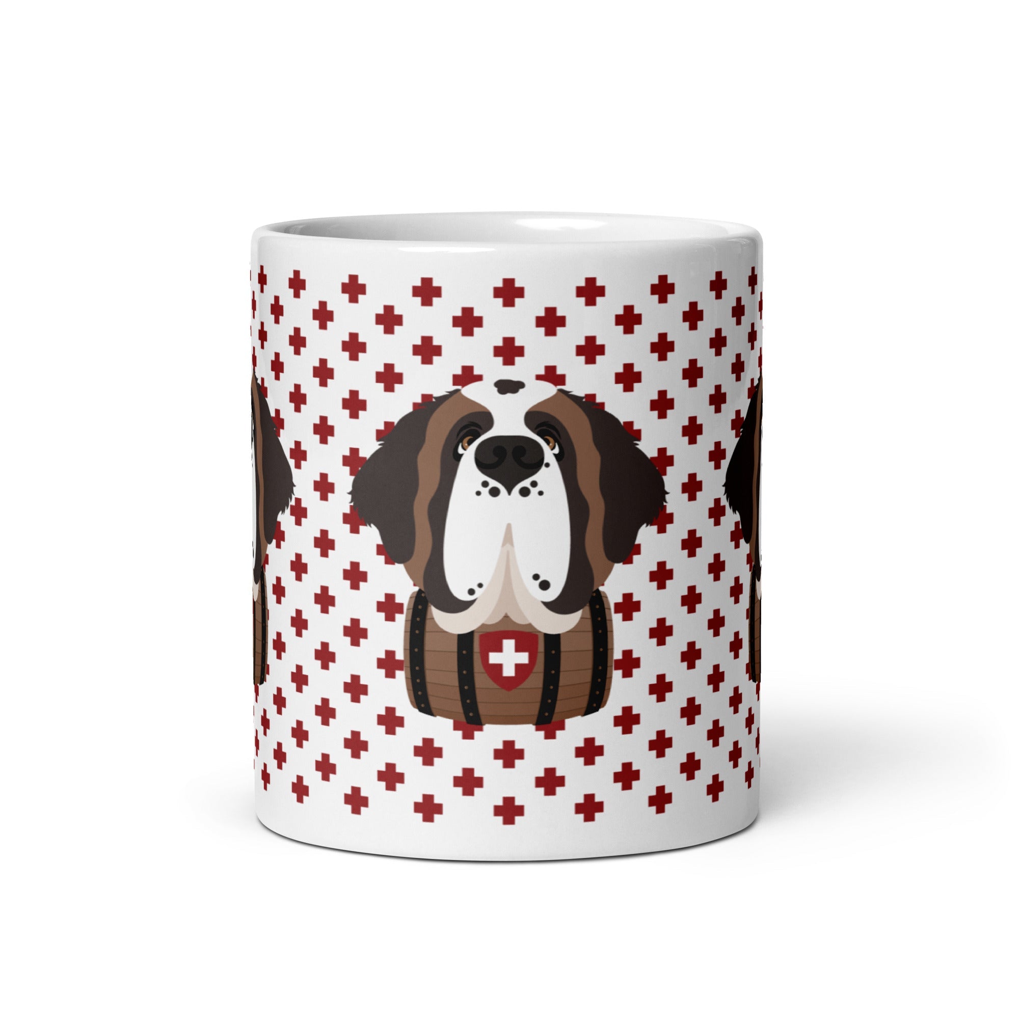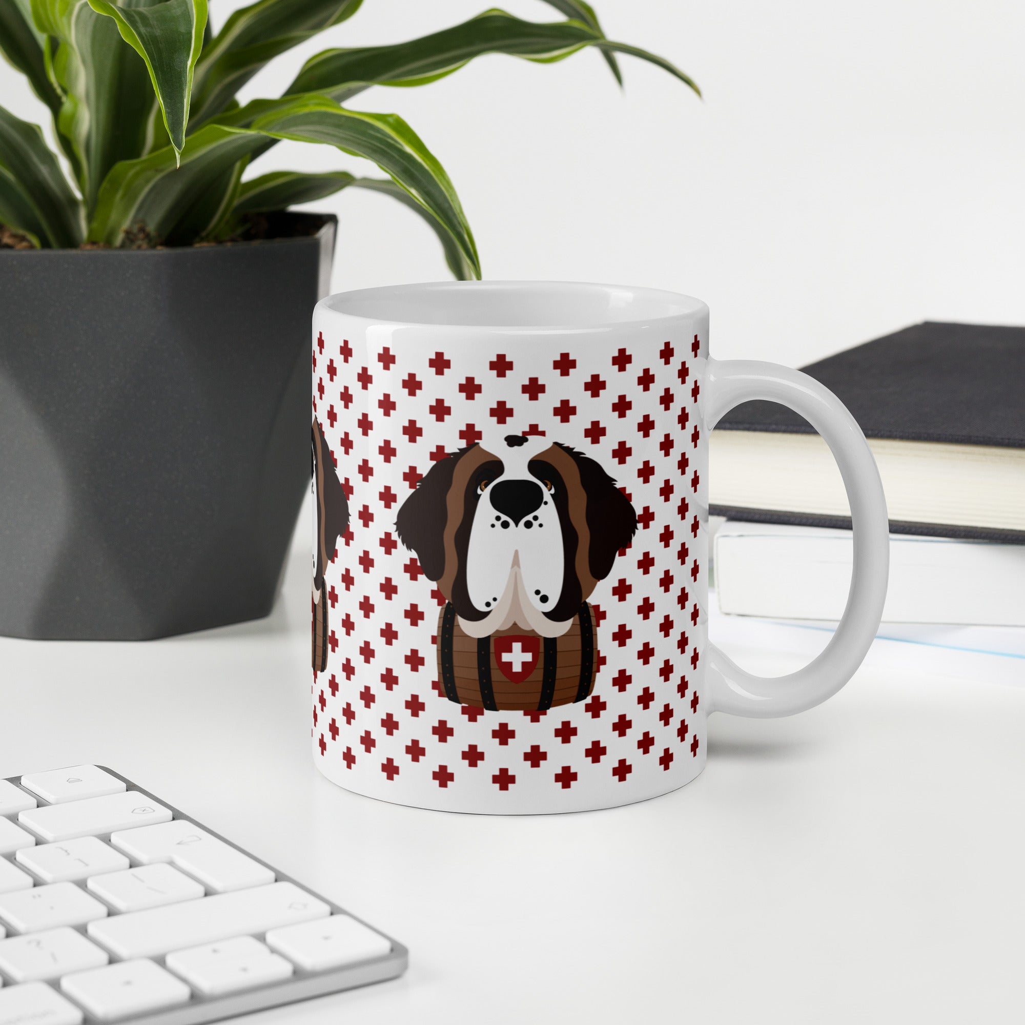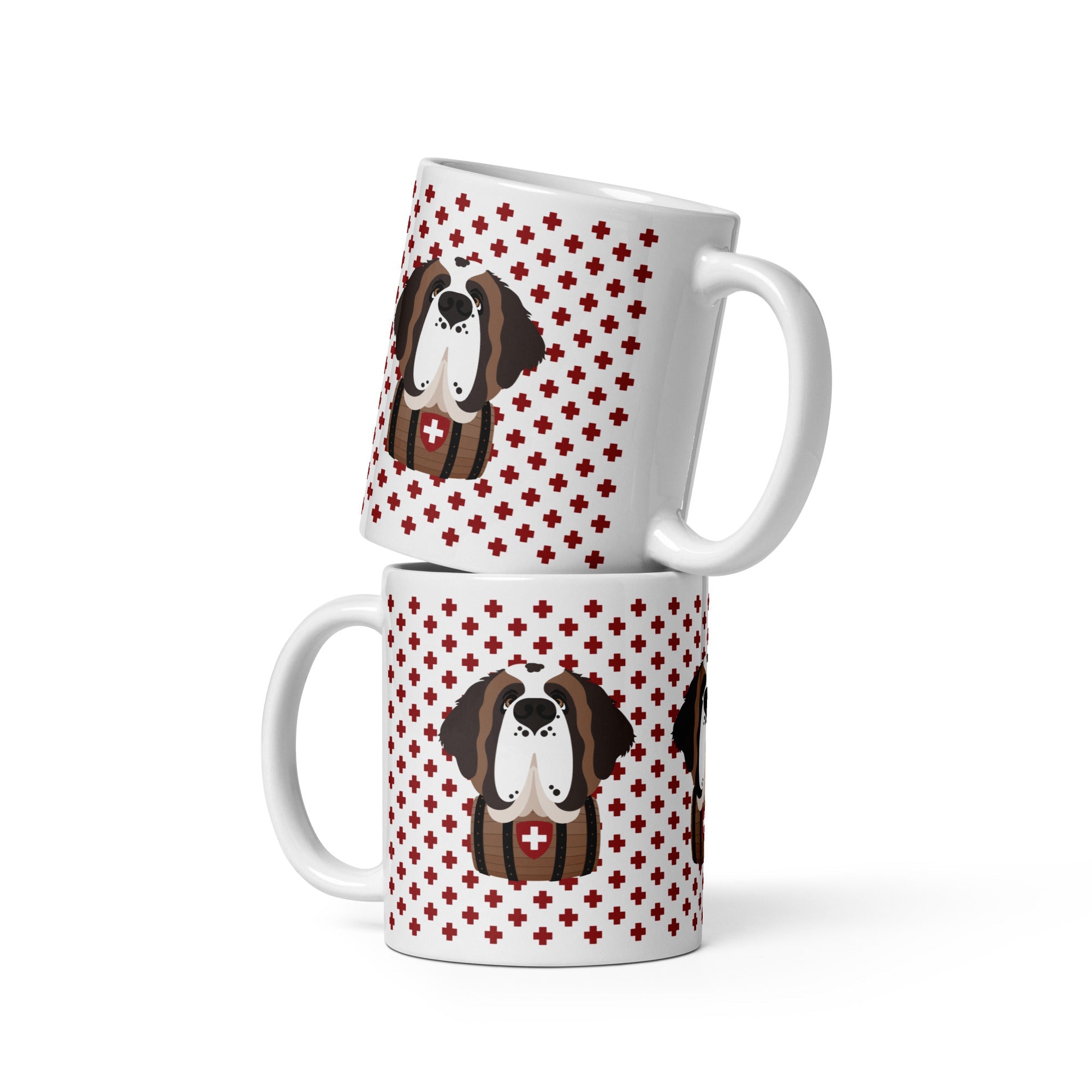 Start your day with a little Swiss magic and a lot of Saint Bernard charm! This sturdy ceramic mug features our beloved Saint Norman on a pattern of red Swiss crosses. Dishwasher and microwave safe, it’s ready to handle your morning coffee, evening tea, or anything in between, with style.