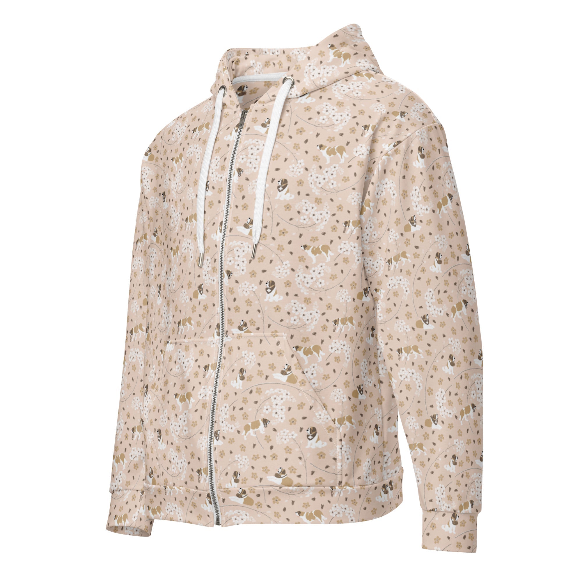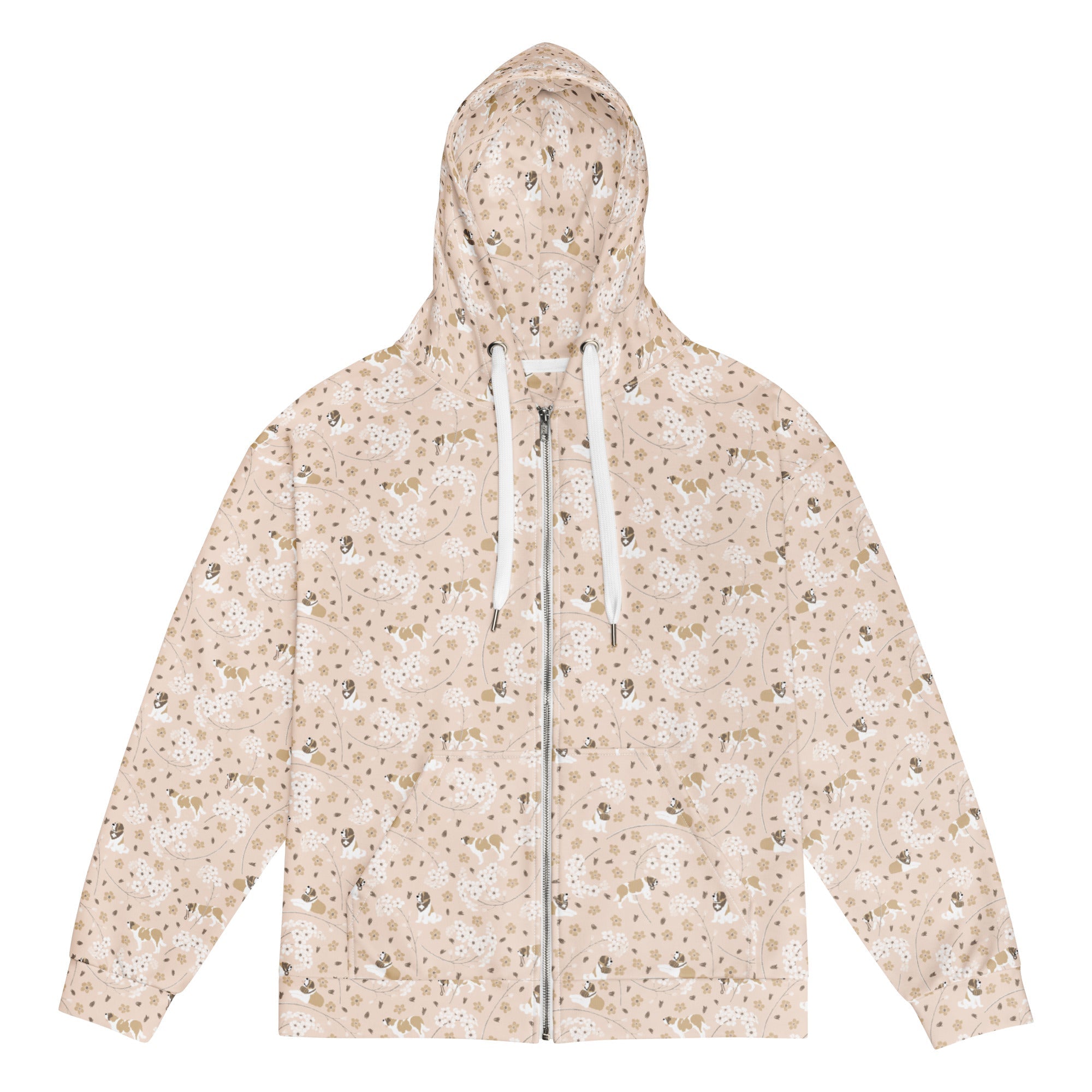 Our Forget Me Not Saint Bernard Zip Hoodie is inspired by delicate Forget Me Not blooms and the gentle spirit of our favorite Saints. With its light floral pattern on a soft peach base, this hoodie brings a touch of floral charm to your everyday wanderings.