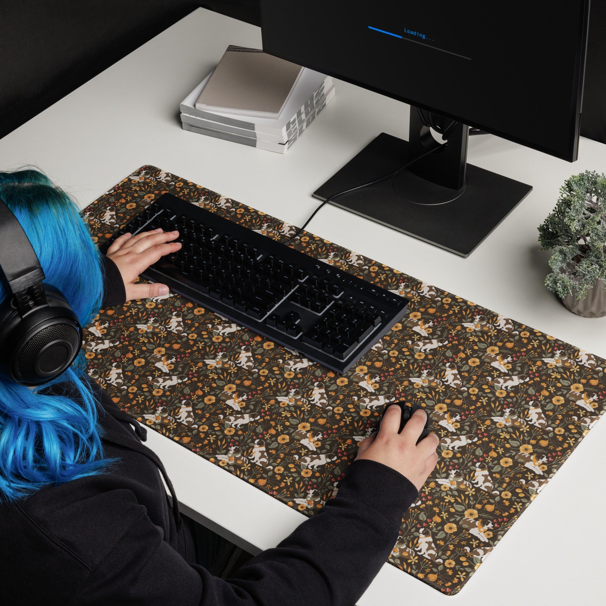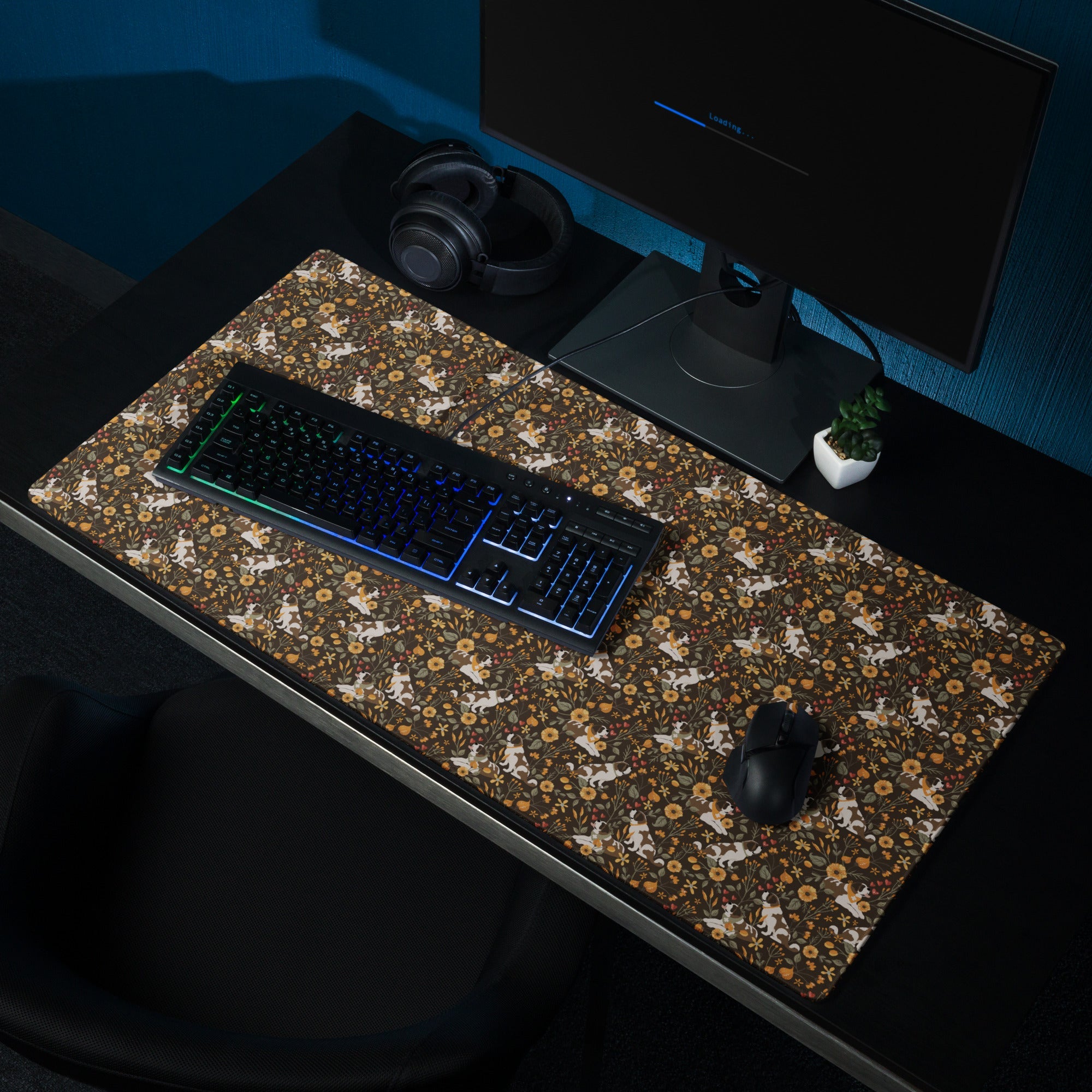 Our Fall Meadow Saint Bernard XL Desk Mouse Pad brings warm fall florals, earthy tones, and giant-sized charm right to your desk inspired by Lucy + Norman’s love for golden leaves, crisp air, and meandering through fall meadows.